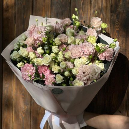 Кустовая хризантема с нежным лизиантусом в сумочке и миксом сухоцвета