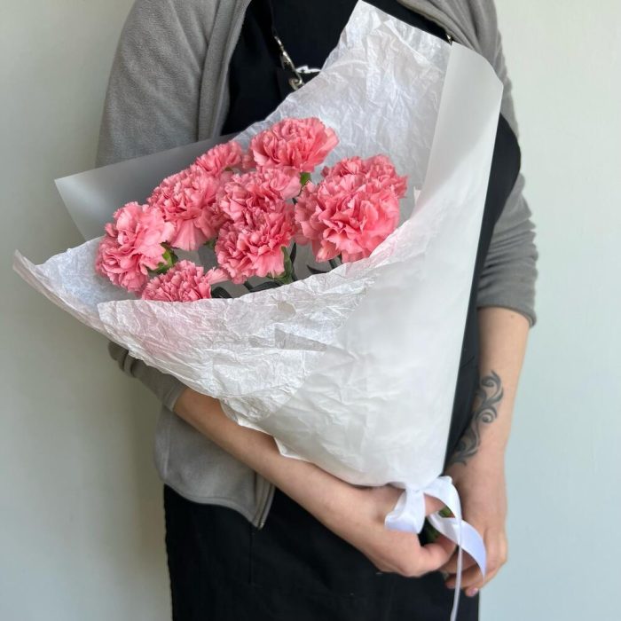 Лента атласная – 1 шт.Диантус – 9 шт.Матовая пленка – 2 шт.Тишью белое – 2 шт.
