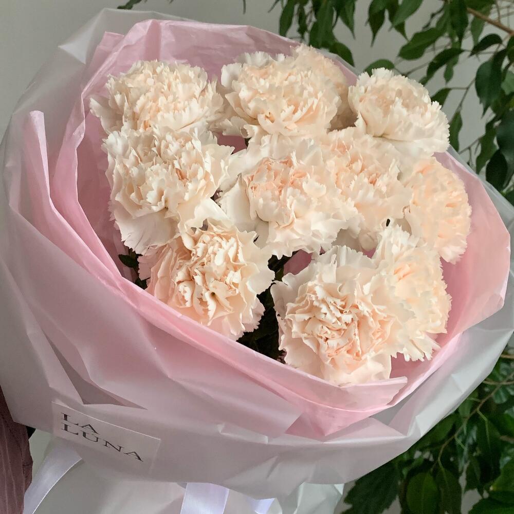 Гвоздика кремовая – 11 шт.Лента атласная – 1 шт.Упаковка дизайнерская – 2 шт.Кризал (подкормка) – 1 шт.Аквапак – 1 шт.инструкция по уходу за цветами – 1 шт.транспортировочная упаковка – 1 шт.