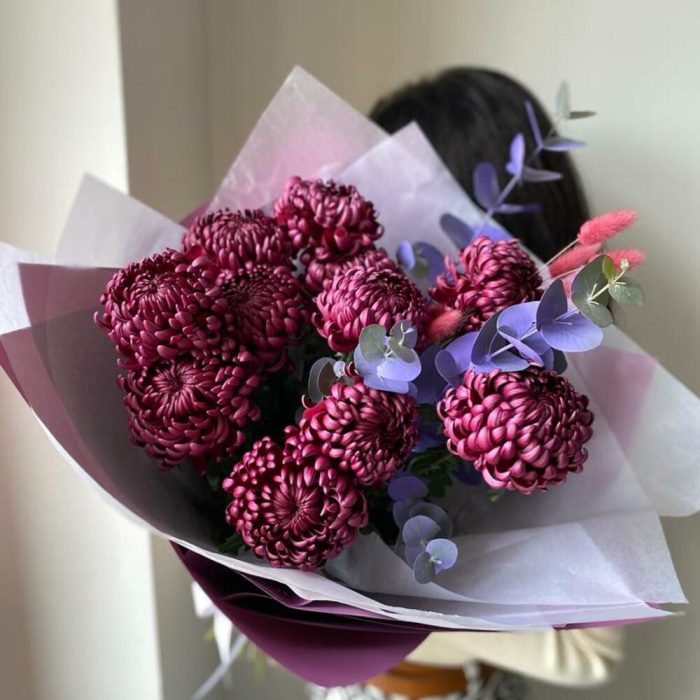 хризантемы – 9 шт. Эвкалипт – 1 шт.