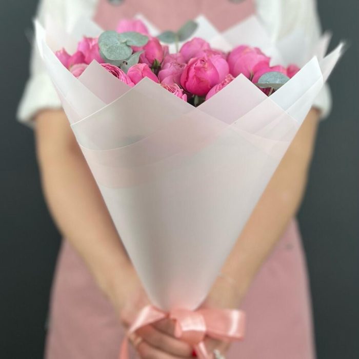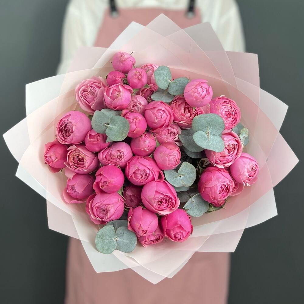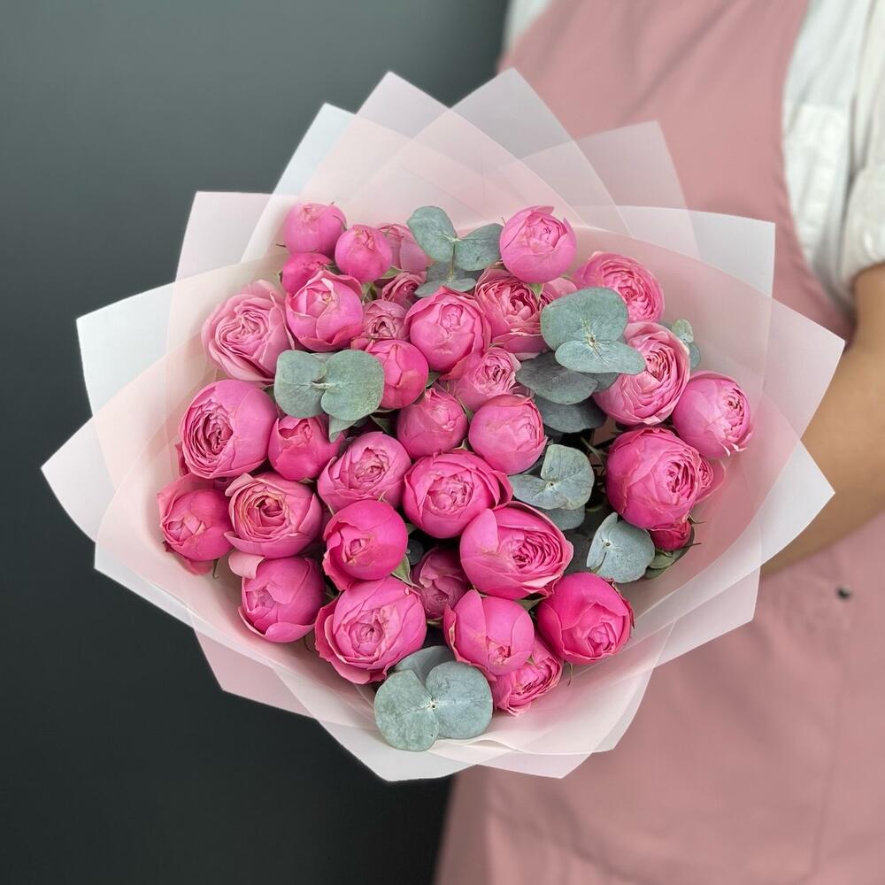 Эвкалипт – 5 шт.Лента атласная – 1 шт.Роза кустовая пионовидная – 7 шт.бумага дизайнерская – 5 шт.