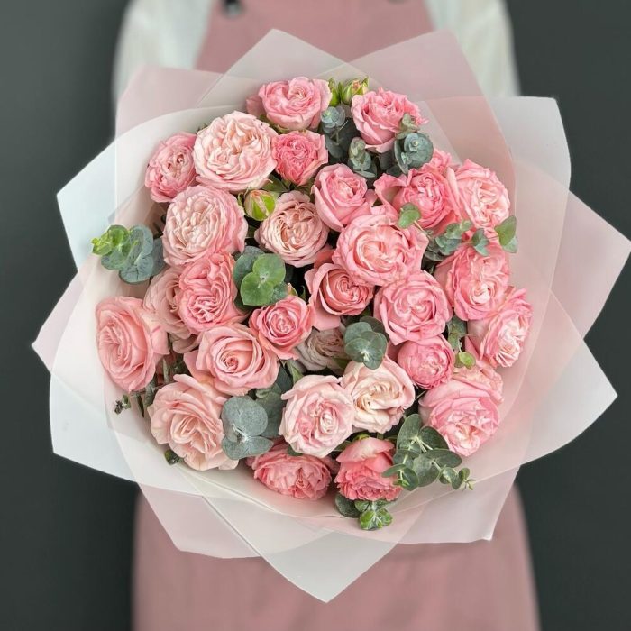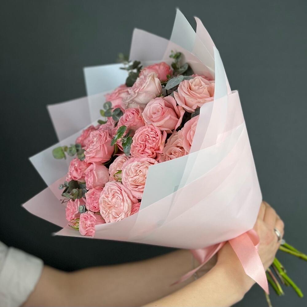 Эвкалипт – 5 шт.Лента атласная – 1 шт.Роза кустовая пионовидная – 7 шт.бумага дизайнерская – 5 шт.