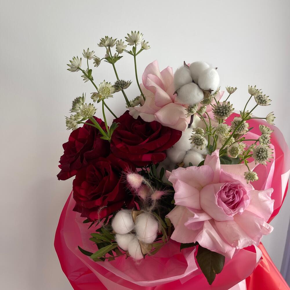 Букет с розами, хлопком и астронцией