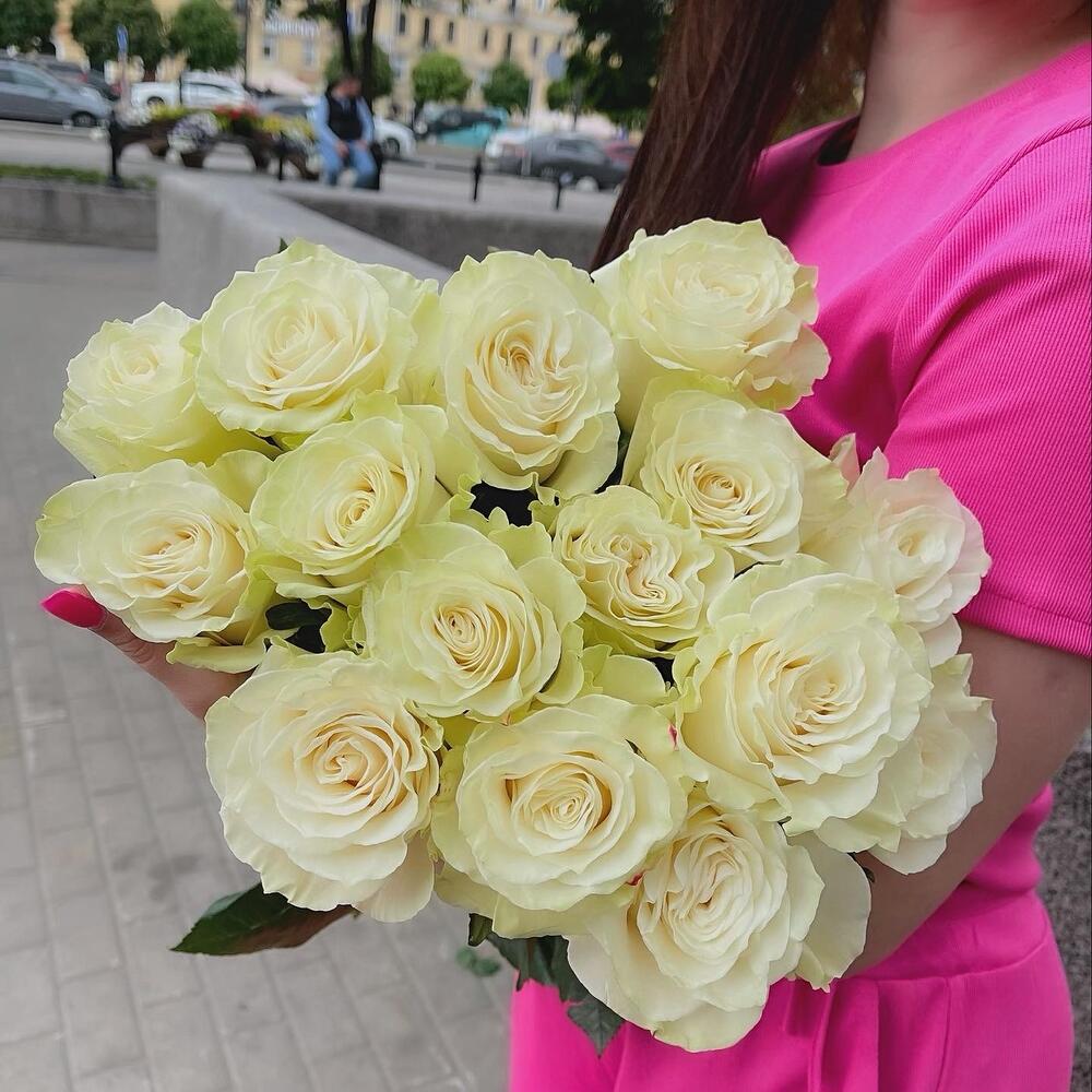 белые розы 60 см – 15 шт.Лента атласная – 1 шт.