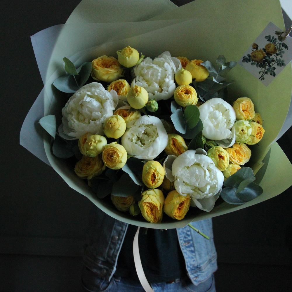 Пион белый – 5 шт.Пионовидная кустовая роза – 5 шт.Эвкалипт – 7 шт.Упаковка – 2 шт.Лента атласная – 2 шт.Открытка – 1 шт.