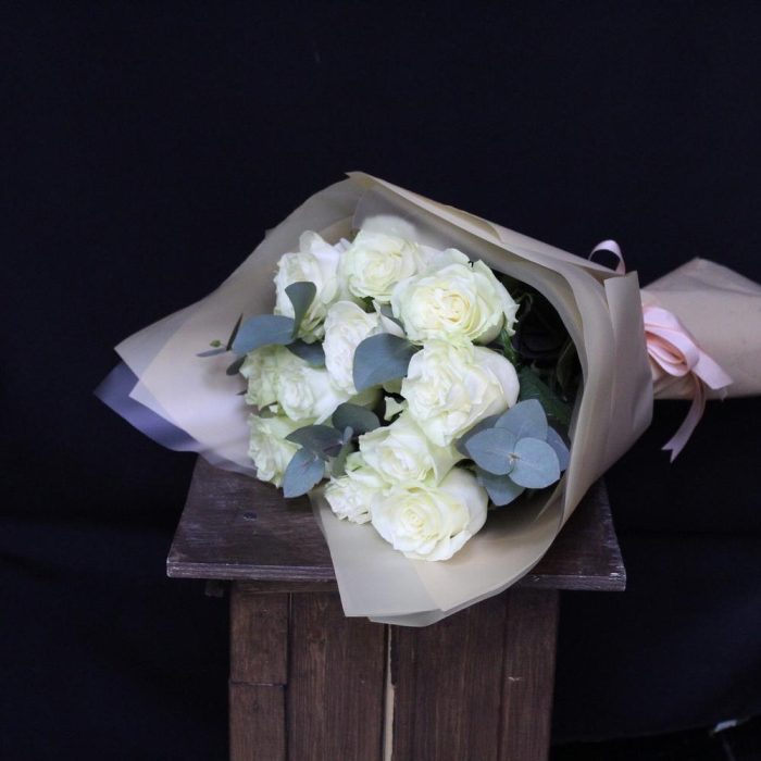 Роза Мондиаль – 11 шт.Эвкалипт – 3 шт.Пленка матовая – 5 шт.Лента атласная – 2 шт.