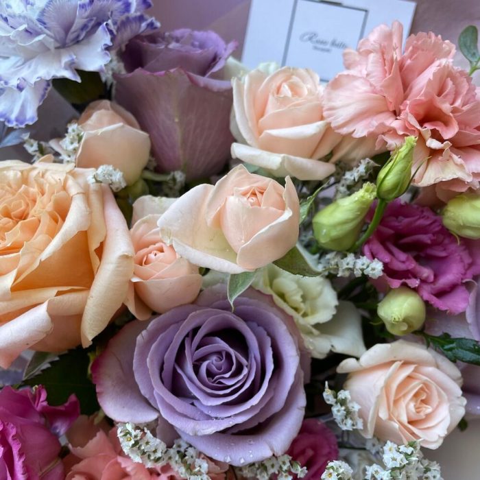 Маттиола – 1 шт.Папоротник – 1 шт.Роза кустовая – 1 шт.Эвкалипт – 1 шт.Диантус – 4 шт.Упаковка дизайнерская – 1 шт.Лимониум белый – 1 шт.Лизиантус Алиса белый – 1 шт.Лизиантус алиса розовый – 1 шт.Роза шиммер – 1 шт.роза грэй найтс – 3 шт.